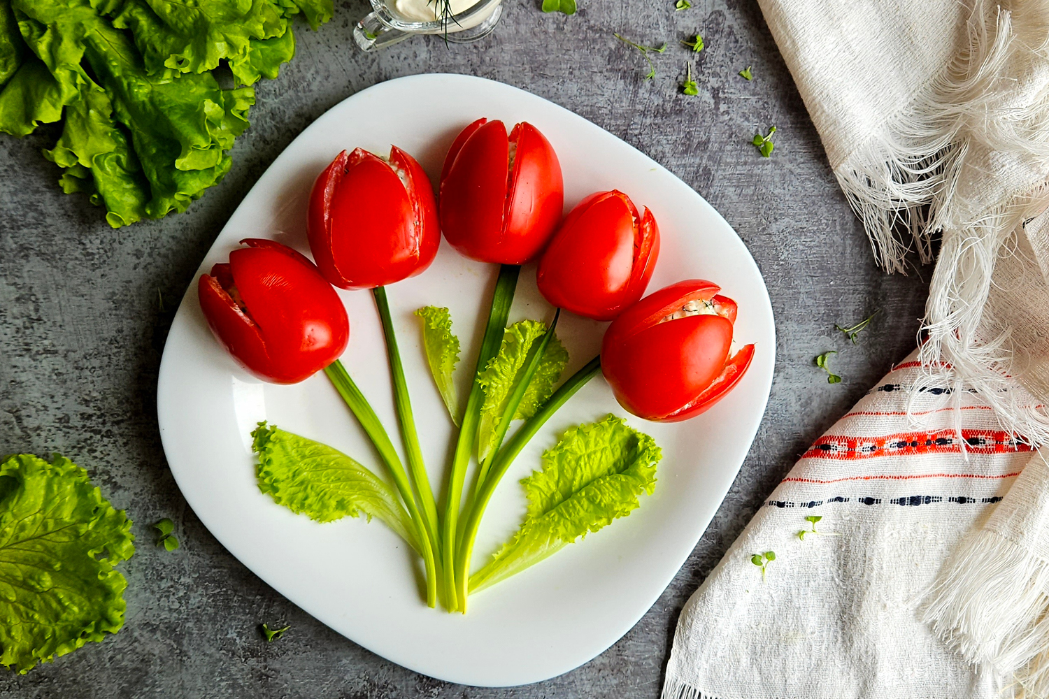 Очень простая в приготовлении закуска добавит свежести и яркости вашему столу. Вам понадобится рассольный сыр, зелень, чеснок — всё измельчить, перемешать со сметаной и начинить помидоры. А если нужны подробности, то вам сюда.