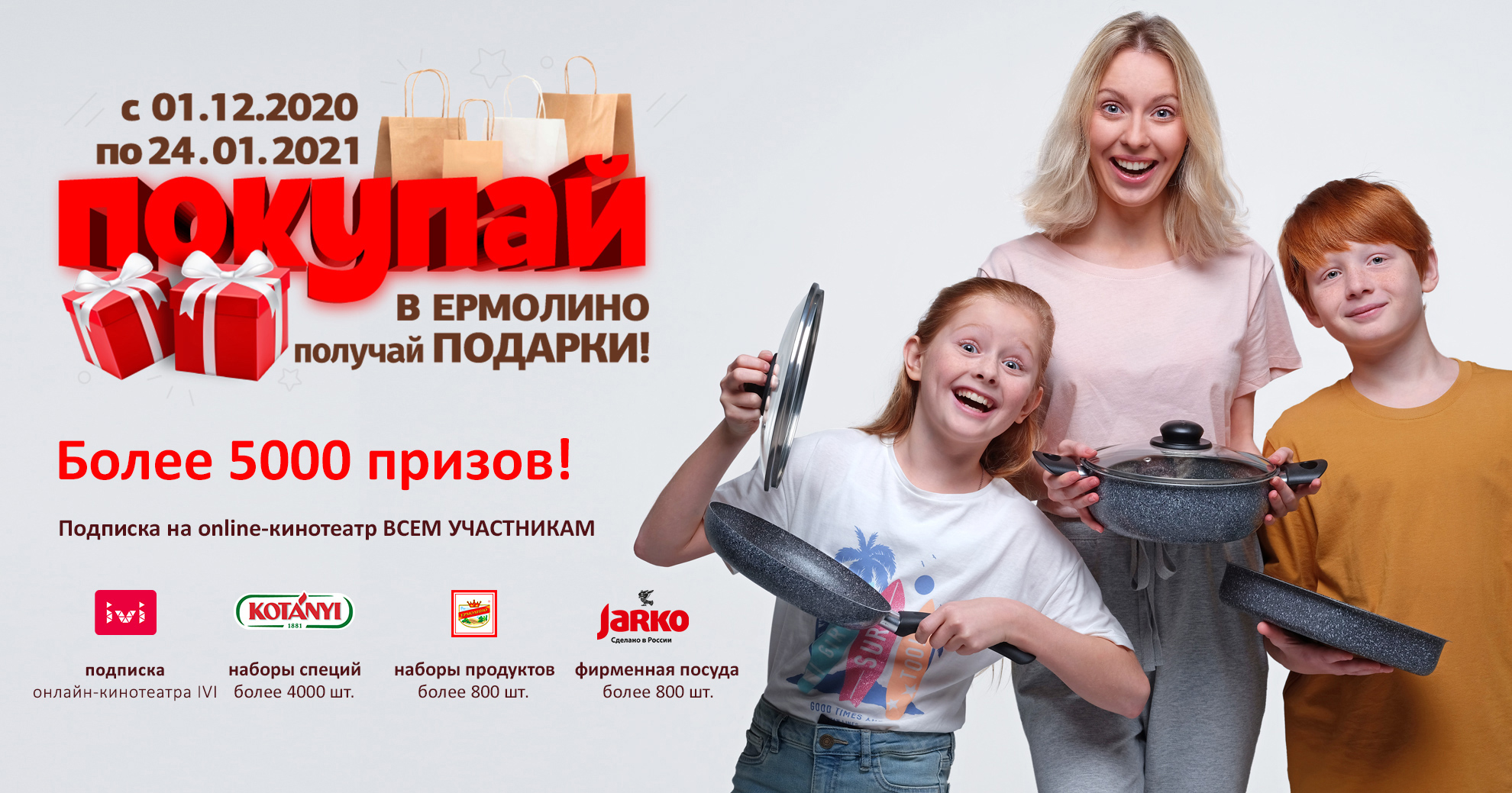 Главным подарком — сертификатом на подписку на онлайн-кинотеатр IVI на 1 год, полгода или 3 месяца — вы можете воспользоваться сразу же после его получения на электронную почту, указанную при регистрации или получить в бумажном виде в фирменном магазине ТМ «ЕРМОЛИНО» (по желанию победителя).