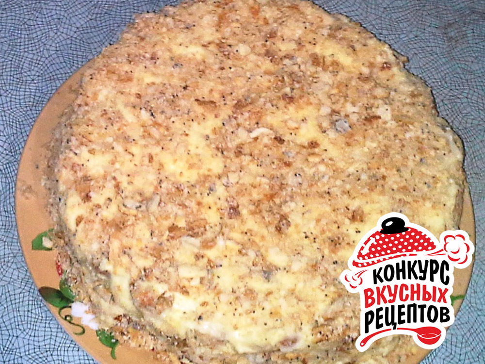 8. Оставшимся кремом смазать верх и бортики торта. А оставшееся печенье растолочь и обсыпать ими готовый торт.